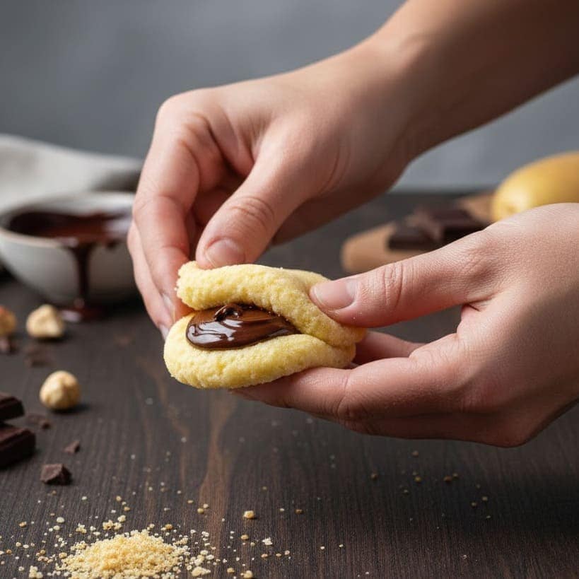 Prendete una piccola porzione di impasto e appiattitela sul palmo della mano. Adagiate al centro qualche quadratino di cioccolato o un cucchiaio di crema spalmabile alle nocciole. Richiudete formando una pallina o una piccola forma di toast, facendo attenzione a sigillare bene il ripieno all’interno.